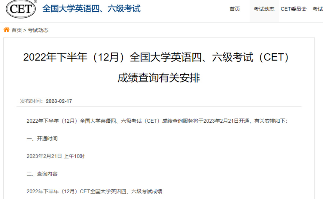 2022年下半年(12月)全国大学英语四、六级考试(CET)成绩查询服务将于2023年2月21日开通,有关安排如下: